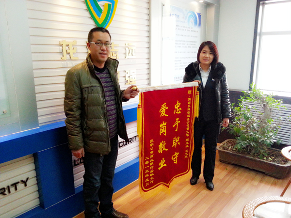 2015年1月份,一位八十多歲高齡的老人到張家口市商業(yè)銀行某支行辦理取錢(qián)業(yè)務(wù)時(shí),因老人年事已高患有老年病,與銀行的工作人員發(fā)生了沖突,無(wú)論工作人員如何解釋?zhuān)詿o(wú)法溝通,至此,老人經(jīng)常到該行找工作人員滋事,老人的行為嚴(yán)重影響到支行的正常業(yè)務(wù),為客戶辦理業(yè)務(wù)帶來(lái)了不便,為維護(hù)好銀行正常秩序,我公司派駐支行的保安隊(duì)員顧龍液、王文來(lái),主動(dòng)接近老人進(jìn)行勸阻,交流溝通,問(wèn)寒問(wèn)暖,緩解老人心態(tài)。之后我公司曹文平隊(duì)長(zhǎng)得知此事,也趕到支行協(xié)助處理,幫忙找到了老人的家人,在家人的勸說(shuō)下,老人離開(kāi)了支行,支行恢復(fù)了正常的工作秩序。經(jīng)過(guò)此事,我公司保安大隊(duì)長(zhǎng)曹文平及派駐到張家口市商業(yè)銀行的保安隊(duì)員顧龍液、王文來(lái)受到了張家口市商業(yè)銀行支行領(lǐng)導(dǎo)的高度贊揚(yáng),特到我公司送來(lái)了錦旗與表?yè)P(yáng)信,對(duì)我公司進(jìn)行感謝。